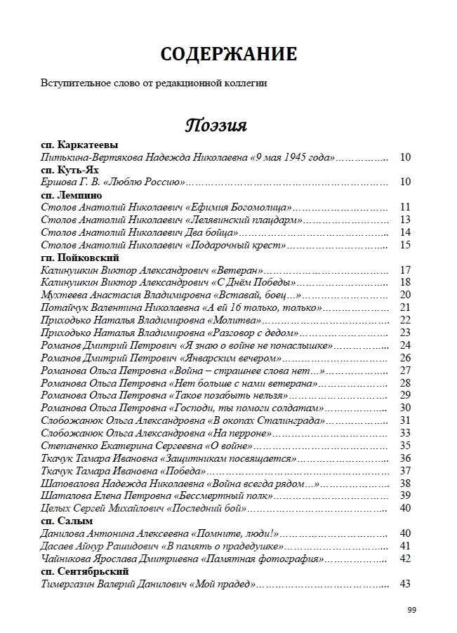 В сборнике собраны прозаические и поэтические произведения, художественные работы воспитанников Детской школы искусств гп. Пойковский и Детской школы искусств им. Г. С. Райшева сп. Салым. Подготовлен в рамках мероприятий, посвященных 80-летию Победы в Великой Отечественной войне 1941-1945 годов.