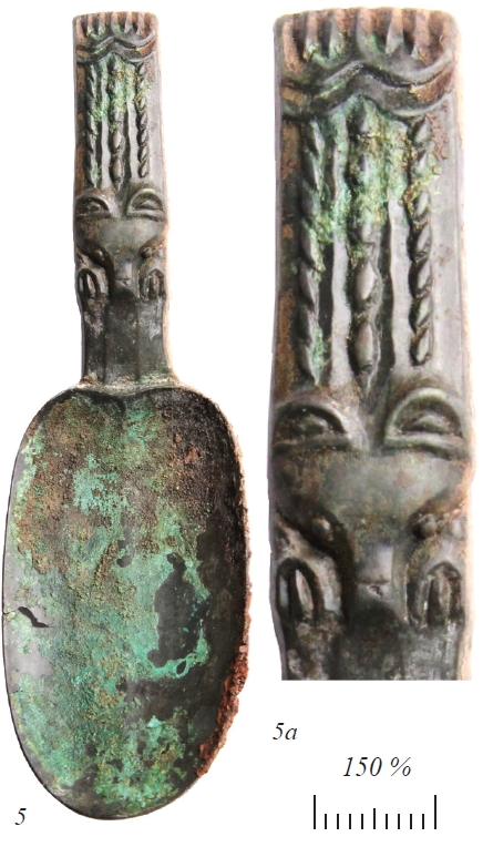 Из находок следует отметить височные кольца; гривны, изготовленные из круглого дрота, простые и витые, а также плоские, из серебра и бронзы; крупные фрагменты наборных поясов с многочисленными накладками, железные ножи. В погребении 1 обнаружен перстень, фрагменты зооморфного литого изделия и антропоморфной личины. В парном погребении 2 обнаружены браслет в виде спирали, бронзовый колокольчик и ложка с зооморфным изображением на рукояти. В погребениях 3 и 4 найдены палаши, они обнаружены вместе с остатками деревянных ножен.