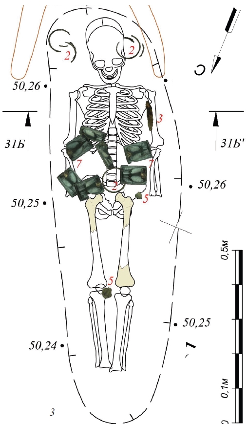 Кроме этого, в пространстве между могилами обнаружены украшения и наконечники стрел отдельно лежащие или воткнутые в грунт. Данные находки интерпретируются как инвентарь поминального комплекса синхронного с захоронениями.