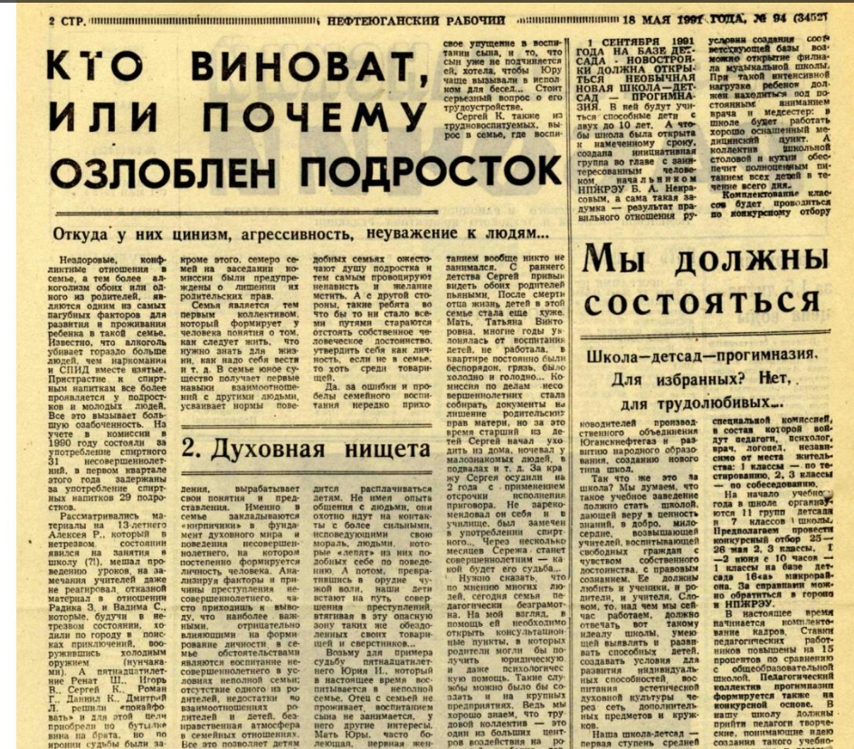 В 1991 году газета «Нефтеюганский рабочий» прекращает традицию праздновать День пионерии. Ленинская идеология попала практически под запрет. Уже не публикуются традиционные отчеты вожатых и заметки юных пионеров. Пионерское движение потухло как костёр в ливень перемен. На страницах газеты в майские дни выходили уже другие статьи с совсем другими заголовками – «Кто виноват, или почему озлоблен подросток». Неожиданно, хотя и закономерно, вскрылись недостатки общества. Ведь организованная работа с пионерами не велась с 1987 года. А самоорганизация молодежных движений не принесла существенных результатов. В потоке идеологического хаоса к 1998 году в газетах уже звучали пугающие заголовки о детях-наркоманах, о том почему школьники мечтают стать рэкетирами, о проблемах школ-интернатов и о росте сирот в Нефтеюганском районе.