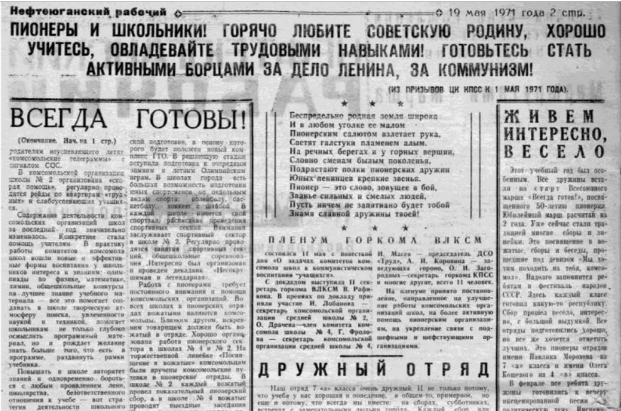 В 1977 году газета «Нефтеюганский рабочий» опубликовала очень много сообщений от учеников пионерских отрядов. Обычно в газету писали пионервожатые. Но в этот раз полосы газеты были посвящены ученикам и их рассказам о пионерской жизни и своих кумирах.