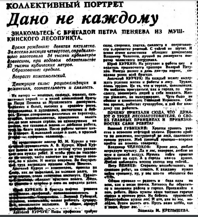 Юрий Куркин: В бригаде широко развита освоение профессией, взаимозаменяемость и взаимовыручка. Зиновий Губицкий, молодой комсомолец может работать сучкорубом, помощником вальщика. В общем лесоруб широкого профиля.