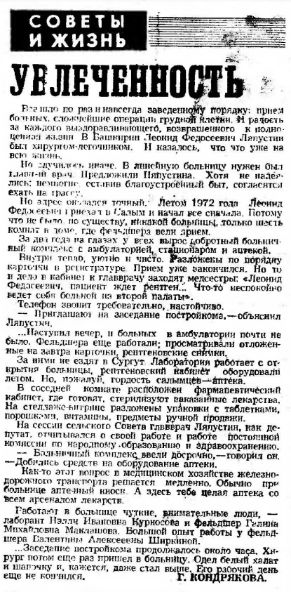 Но адрес оказался точный. Летом 1972 года Леонид Федосеевич приехал в Салым и начал всё сначала. Потому что не было по существу, никакой больницы, только шесть комнат в доме, где фельдшера вели прием.