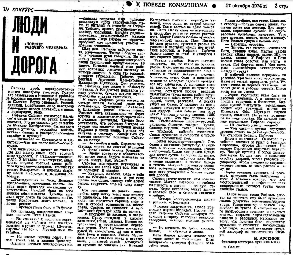 ...В тот вечер, когда Рафаэль работал на перегоне, ему было присвоено звание ударника коммунистического труда. Удостоверение и значок ему вручали на трассе. Я смотрел на этого низкорослого крепыша с круглым лицом, острыми проницательными глазами и радовался. Радовался потому, что приятно быть свидетелем мужества и смелости комсомольца 70-х годов, который оставляет трудовой автограф на новостройках Сибири.