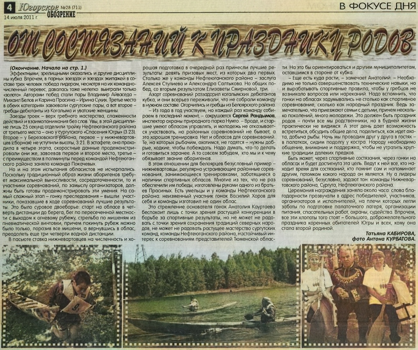 - Еще есть куда расти, - замечает Анатолий. - Необходимо не только совершенствовать технические навыки, но и вырабатывать спортивные правила, чтобы у гребцов не возникало вопросов или нареканий. Надо вспомнить, что гонки на обласах задумывались не столько как спортивное соревнование, сколько как народный праздник. Ведь замечательно, что приезжают семьи с детьми, причем несколько поколений, много молодежи Это должен быть праздник родов - почти все мы родственники, но в будней жизни практически не видимся. А этот день дает возможность встретиться, обсудить общие дела, поделиться, как идет охота, добыча рыбы. Ночь мы проводим друг у друга в гостях в палатках, сидим подолгу у костра. Народу необходимо общение, внимание и поддержка, чтобы не утратить хрупкие традиции далеких предков.
