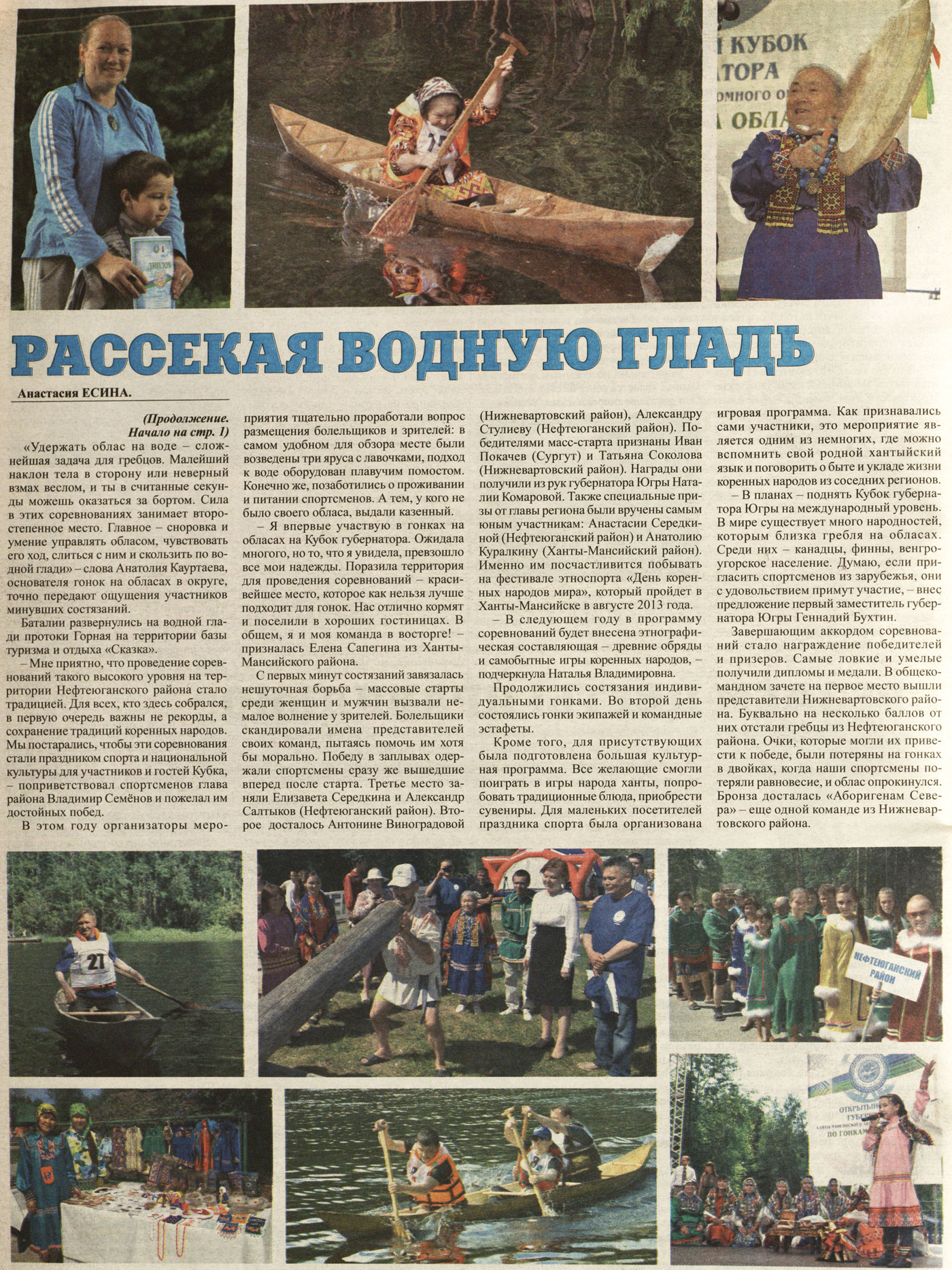 С первых минут состязаний завязалась нешуточная борьба - массовые старты среди женщин и мужчин вызвали немалое волнение у зрителей. Болельщики скандировали имена представителей своих команд, пытаясь помочь им хотя бы морально. Победу в заплывах одержали спортсмены сразу же вышедшие вперед после старта. Третье место заняли Елизавета Середкина и Александр Салтыков (Нефтеюганский район). Второе досталось Антонине Виноградовой (Нижневартовский район), Александру Стулиеву (Нефтеюганский район). Победителями масс-старта признаны Иван Покачев (Сургут) и Татьяна Соколова (Нижневартовский район). Награды они получили из рук губернатора Югры Наталии Комаровой. Также специальные призы от главы региона были вручены самым юным участникам: Анастасии Середкиной (Нефтеюганский район) и Анатолию Куралкину (Ханты-Мансийский район). Именно им посчастливится побывать на фестивале этноспорта «День коренных народов мира», который пройдет в Ханты-Мансийске в августе 2013 года.