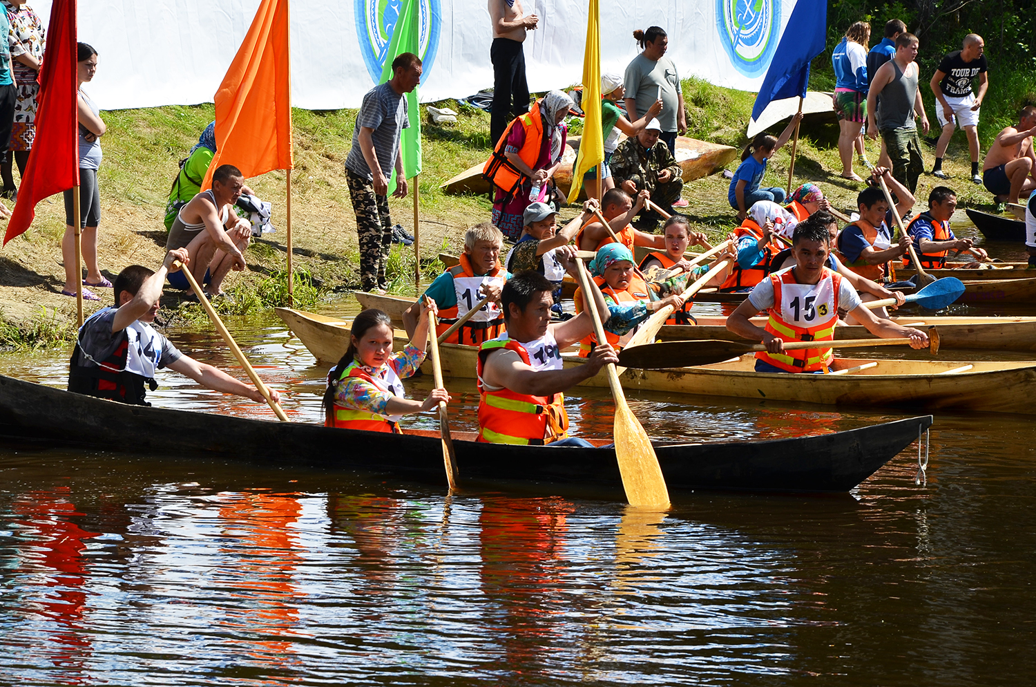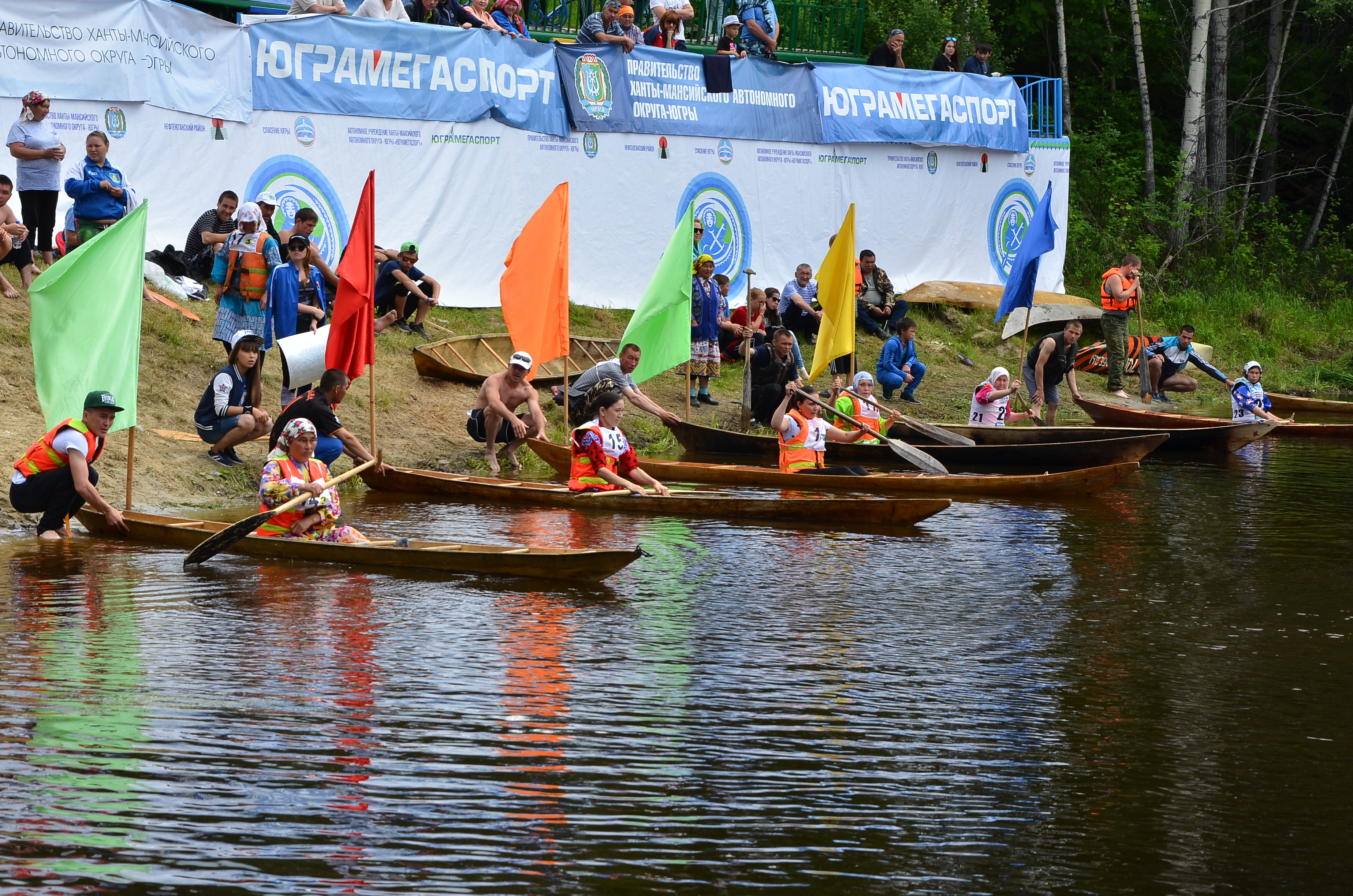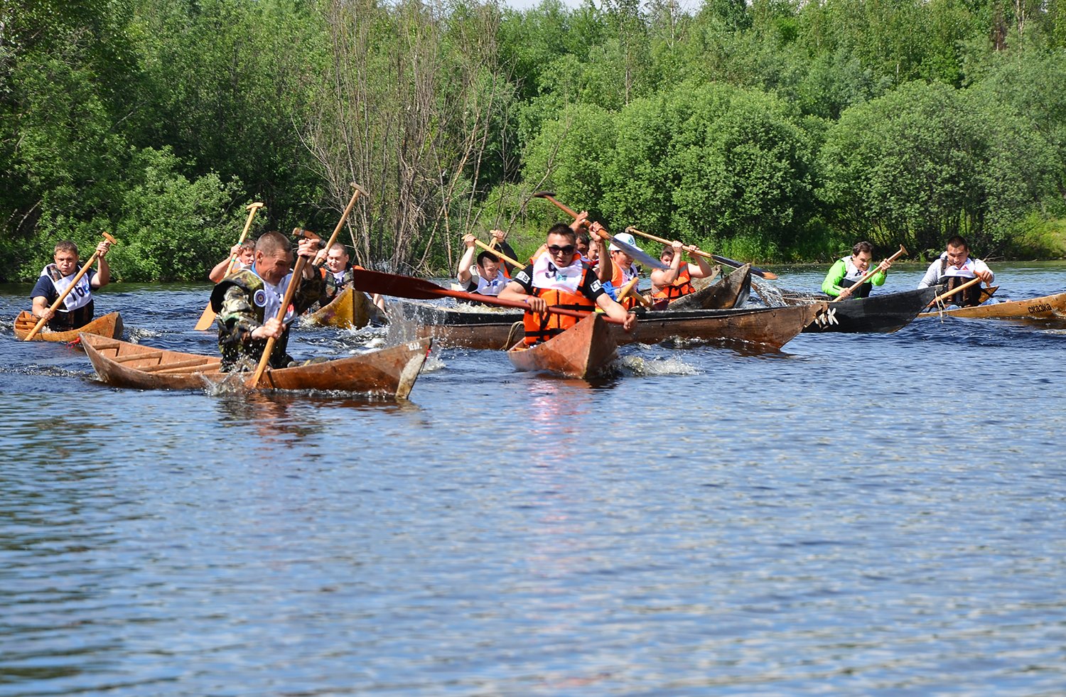 Только после того, как старейшины получили добро от Водного духа и заручились его поддержкой, было объявлено начато соревнований. Первыми состоялись массовые старты у мужчин. Акваторию заполонило множество лодок-долбленок, которые одновременно вступили в состязание. Борьба была жесткой. Кто-то потерпел неудачу сразу после старта, других неприятные сюрпризы ожидали после благополучного выхода на дистанцию: не всегда удавалось уйти от столкновения с другим обласом, избежать набора воды в лодку, успешно совершить поворот, не потерять скорость. Иногда случались перевороты судна, и участник в мгновение ока оказывался в воде. На помощь тут же приходили спасатели, дежурившие на моторных лодках поблизости. Болельщики без устали подбадриваю спортсменов не только криками, пожеланиями, но и берущими за душу песнями, преимущественно на хантыйском языке. «О сильных духом людях, которые живут на югорской земле и уверенно шагают в светлое будущее...» - спела стоя на пирсе, председатель лянторского городского отделения общественной организации «Спасение Югры», член Общественной палаты округа, талантливая певица, музыкант Вера Кондратьева.