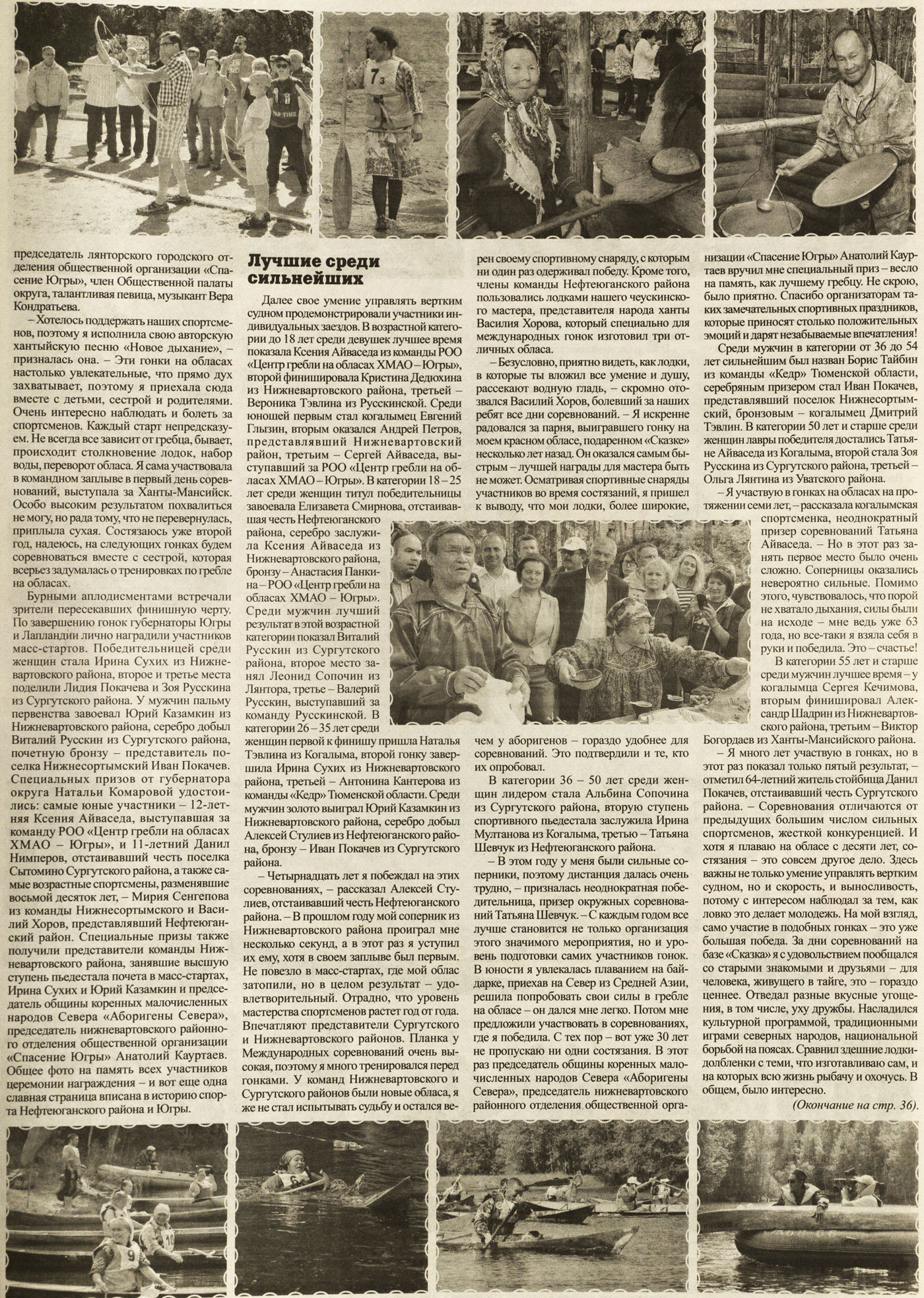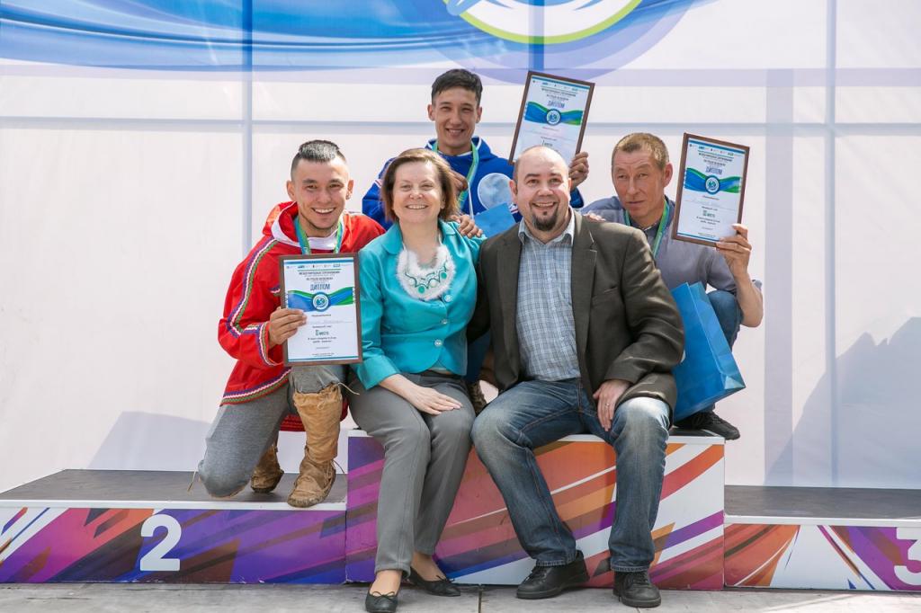 Бурными аплодисментами встречали зрители пересекавших финишную черту. По завершению гонок губернаторы Югры и Лапландии лично наградили участников масс-стартов. Победительницей среди женщин стала Ирина Сухих из Нижневартовского района, второе и третье места поделили Лидия Покачева и Зоя Русскина из Сургутского района. У мужчин пальму первенства завоевал Юрий Казамкин из Нижневартовского района, серебро добыл Виталий Русскин из Сургутского района, почетную бронзу - представитель поселка Нижнесортымский Иван Покачев. Специальных призов от губернатора округа Натальи Комаровой удостоились: самые юные участники - 12-летняя Ксения Айваседа, выступавшая за команду РОО «Центр гребли на обласах ХМАО - Югры», и 11-летний Данил Нимперов, отстаивавший честь поселка Сытомино Сургутского района, а также самые возрастные спортсмены, разменявшие восьмой десяток лет, — Мирия Сенгепова из команды Нижнесортымского и Василий Хоров, представлявший Нефтеюганский район. Специальные призы также получили представители команды Нижневартовского района, занявшие высшую ступень пьедестала почета в масс-стартах, Ирина Сухих и Юрий Казамкин и председатель общины коренных малочисленных народов Севера «Аборигены Севера», председатель нижневартовского районного отделения общественной организации «Спасение Югры» Анатолий Кауртаев. Общее фото на память всех участников церемонии награждения — и вот еще одна славная страница вписана в историю спорта Нефтеюганского района и Югры.
