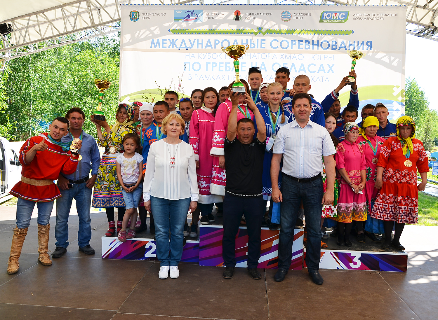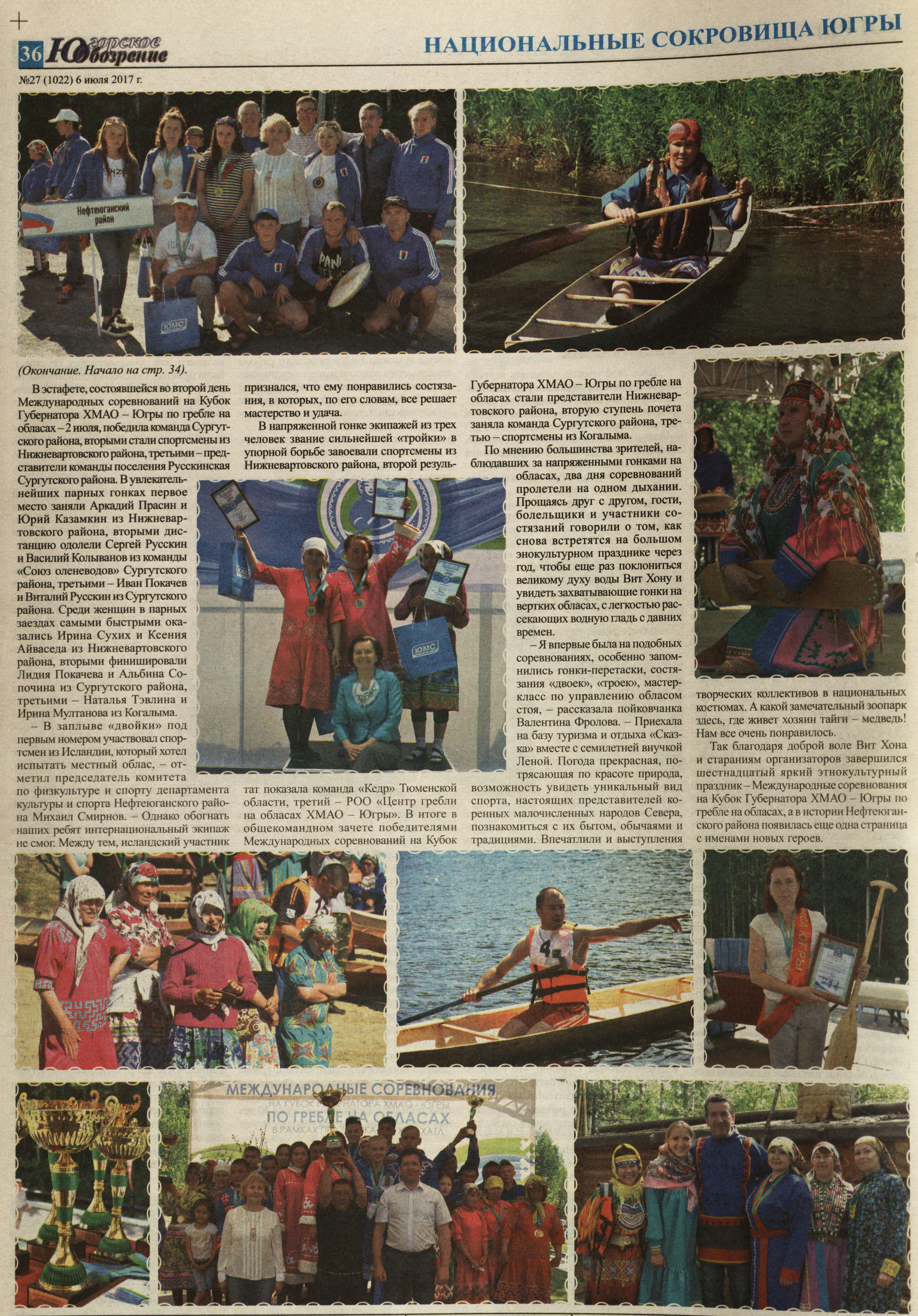 В напряженной гонке экипажей из трех человек звание сильнейшей «тройки» в упорной борьбе завоевали спортсмены из Нижневартовского района, второй результат показала команда «Кедр» Тюменской области, третий - РОО «Центр гребли на обласах ХМАО - Югры». В итоге в общекомандном зачете победителями Международных соревнований на Кубок Губернатора ХМАО — Югры по гребле на обласах стали представители Нижневартовского района, вторую ступень почета заняла команда Сургутского района, третью - спортсмены из Когалыма.