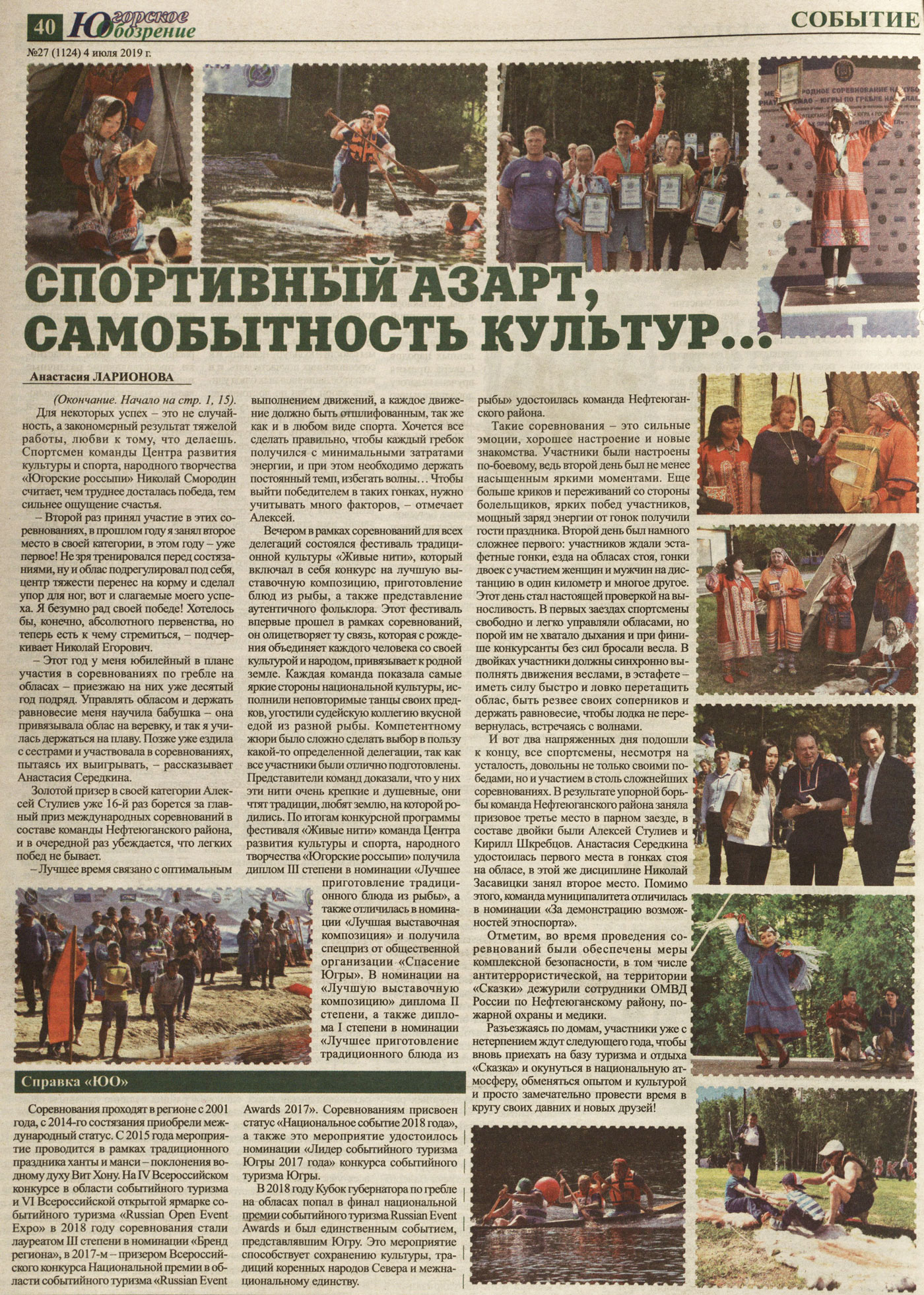 И вот два напряженных дня подошли к концу, все спортсмены, несмотря на усталость, довольны не только своими победами, но и участием в столь сложнейших соревнованиях. В результате упорной борьбы команда Нефтеюганского района заняла призовое третье место в парном заезде, в составе двойки были Алексей Стулиев и Кирилл Шкребцов Анастасия Середкина удостоилась первого места в гонках стоя на обласе, в этой же дисциплине Николай Засавицки занял второе место. Помимо этого, команда муниципалитета отличилась в номинации «За демонстрацию возможностей этноспорта».