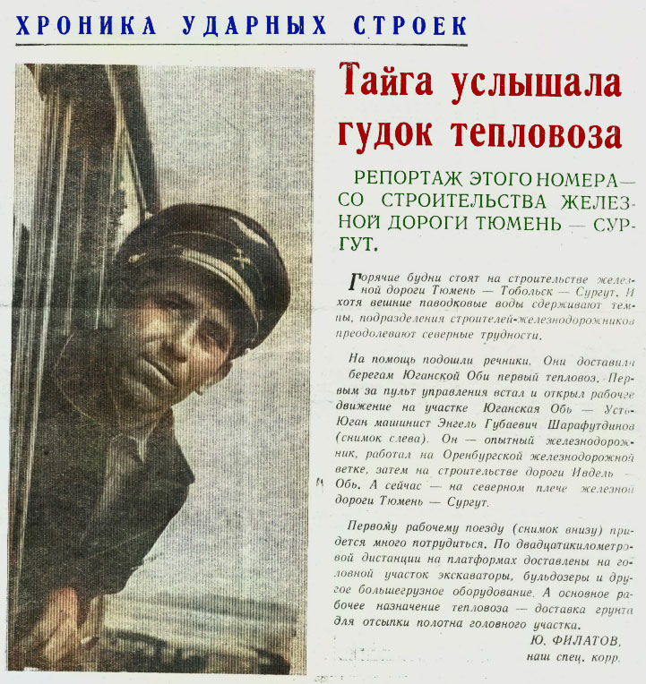 На помощь подошли речники. Они доставили к берегам Юганской Оби первый тепловоз. Первым за пульт управления встал и открыл рабочее движение на участке Юганская Обь — Усть - Юган машинист Энгель Губаевич Шарафутдинов (снимок слева). Он - опытный железнодорожник, работал на Оренбургской железнодорожной ветке, затем на строительстве дороги Ивдель - Обь. А сейчас — на северном плече железной дороги Тюмень - Сургут.