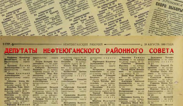 Первые выборы депутатов районного Совета Нефтеюганского района состоялись 24 августа 1980 года. На 17 избирательных участках жители поселений, вошедших в состав образованного Нефтеюганского района, выбирали народных депутатов по 75 избирательным округам. Результаты выборов были опубликованы в газете "Нефтеюганский рабочий" №103 1980 года