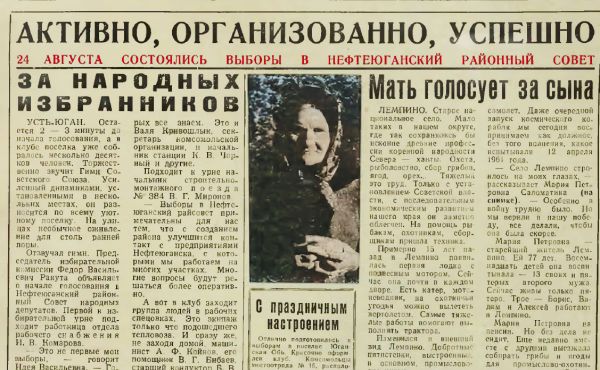 Самой первой пришла на избирательный участок Мария Петровна Саломатина в день выборов. Голосовала она в этот день за Советскую власть, за своего сына — Алексея Гавриловича, которого односельчане назвали представителем в Нефтеюганский районный Совет народных депутатов.