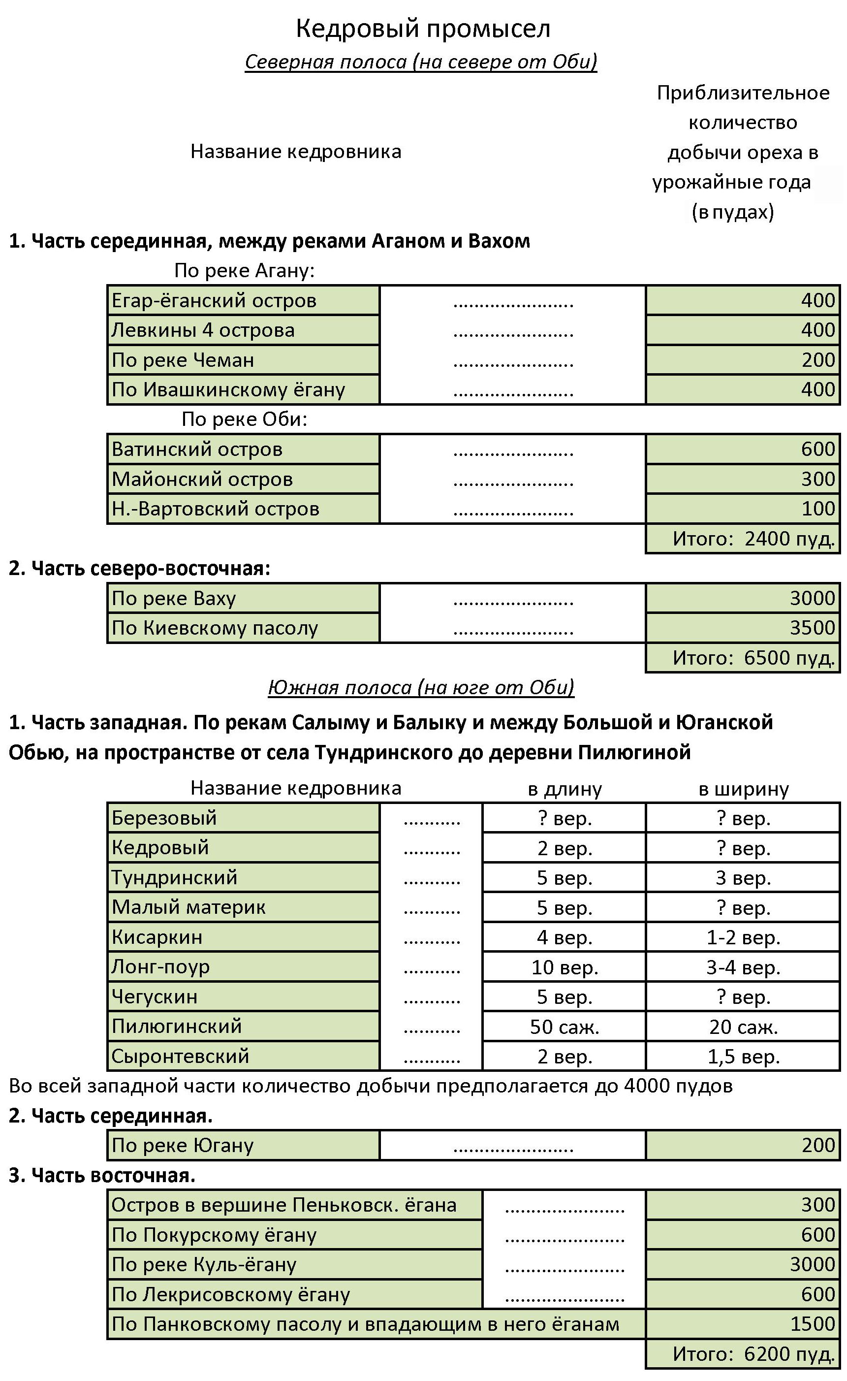 … Лучшие и более значительные кедровники находятся в Сургутском крае, и о них мне удалось собрать более или менее подробные сведения. (Перечень кедровников в таблице)…