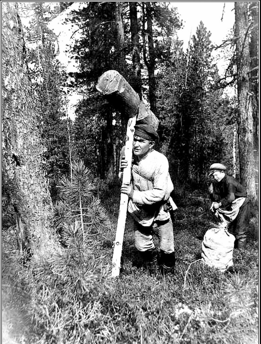 Как к колоту, так и барцу, привязываются две веревки, длиною по две сажени каждая. Для приведения в действие снаряда веревки эти пропускаются через ветви в противоположную от снаряда сторону, так что кедр находится между этими двумя веревками. За концы их берется человек, который опускает постепенно веревки из своих рук, отчего снаряд отклонятся в противоположную от дерева сторону. Около снаряда в это время стоит другой человек, который направляет снаряд так, чтобы удар пришелся по дереву. После этого человек, держащий концы веревок, сильно дергает их к себе, отчего происходит довольно значительный удар по дереву, от которого шишка валится на землю. Веревка к колоту привязывается к концам била, а к барцу – не более, как на 1 аршин от верхнего конца, т.е. комля.