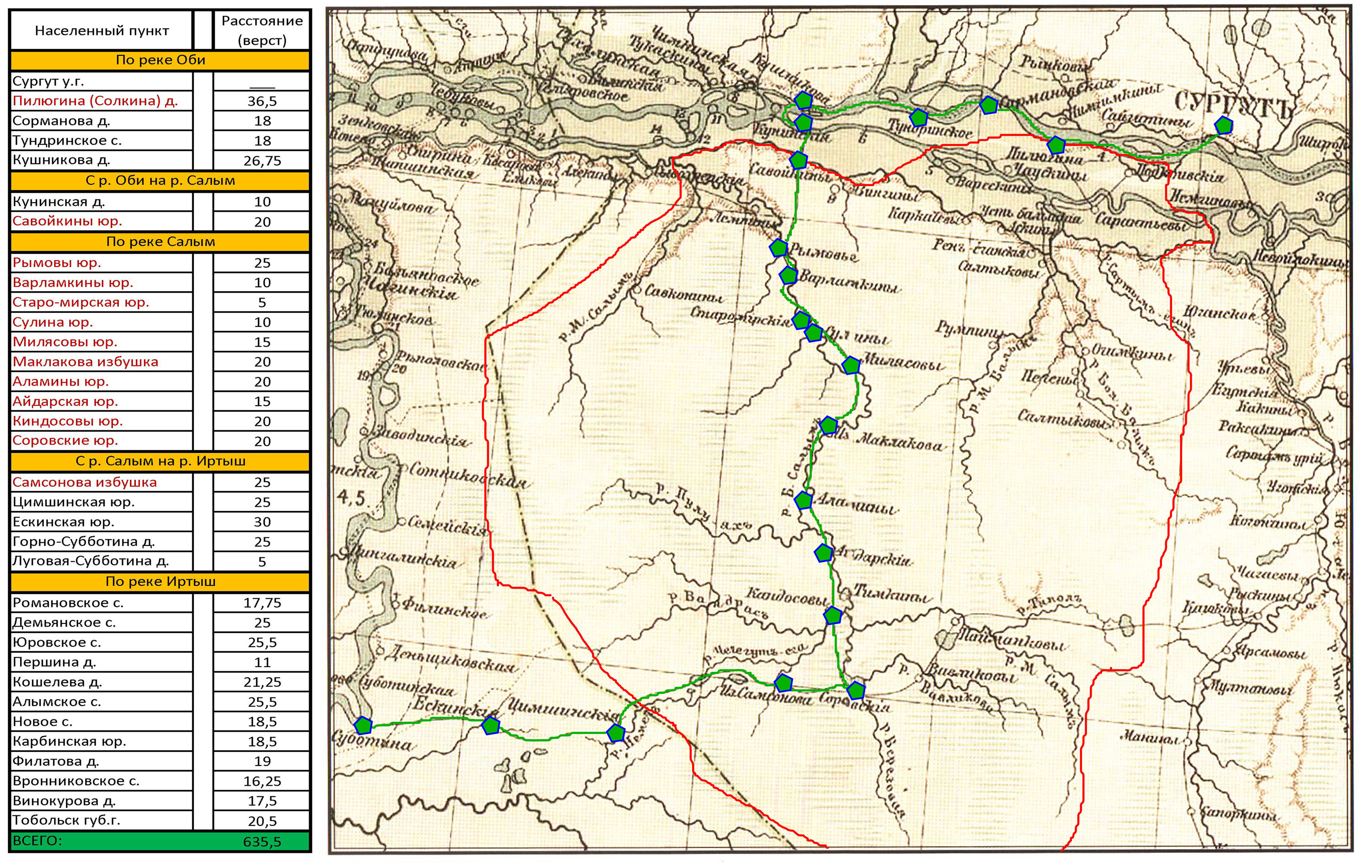 Салымский край также попал в справочник, как важный маршрут по населенным пунктам Сургутского уезда от Сургута до Тобольска по реке Салым длиной в 635,5 верст. Этот маршрут от у.г. Сургута до д. Луговая-Субботина мы рассмотрим поподробнее. Начиная путешествие из Сургута, первой остановкой будет деревня Пилюгина. Сейчас данного поселения нет на карте как административной единицы. Но более ста лет назад эта деревня была ключевой станцией в почтовых и земских трактах Тобольской губернии (как и множество других изчезнувших селений). Примечательно то, что деревня ныне находиться на территории Нефтеюганского района и расположена на реке Оби, недалеко от современного сельского поселения Сингапай. В таблице красным отмечены населенные пункты, которые находятся на территории современного Нефтеюганского района, а на карте схематично обведены границы Нефтеюганского района. По маршруту следования, начиная с юрт Савойкиных путешественник посещает остяцкие поселения бассейна реки Салым.