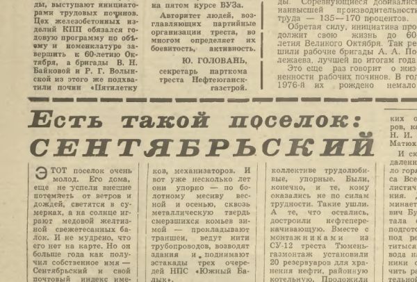 Статья о истории поселка Сентябрьский, его строителях, жителях и перспективах развития. "Нефтеюганский рабочий.№15 77 год"