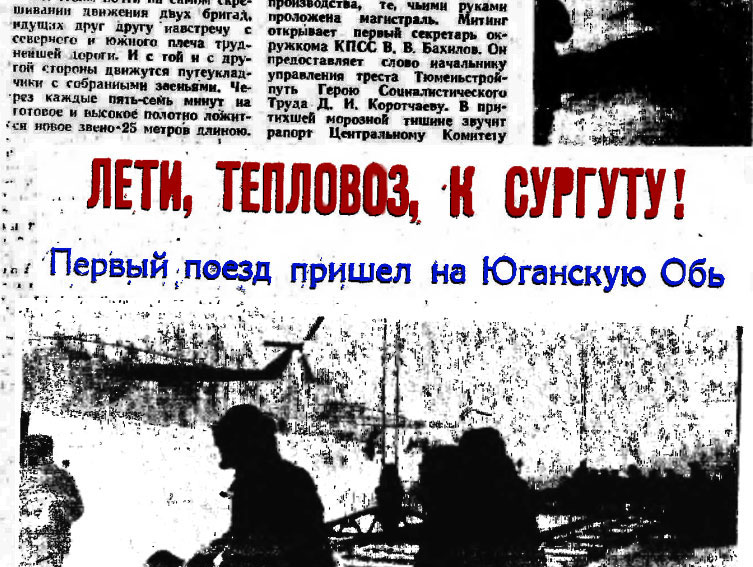 «Лети, тепловоз, к Сургуту. Первый поезд пришёл на Юганскую Обь» (газета «К победе коммунизма» №144 1973 год)